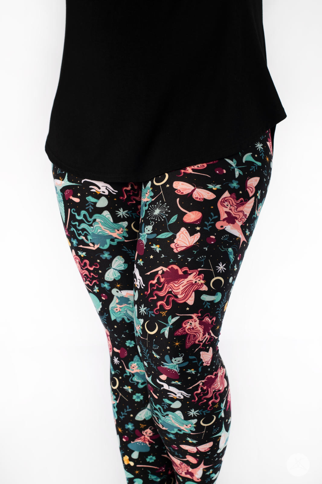 Fairy Garden is a super fun print that showcases a mystical forest wonderland of fairies, mushrooms, wands and 4-leaf clovers, in shades of pinks and teals on a black background.