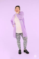 These romantic and serene leggings offer a large scale rose pattern in lavender and shades of grey.