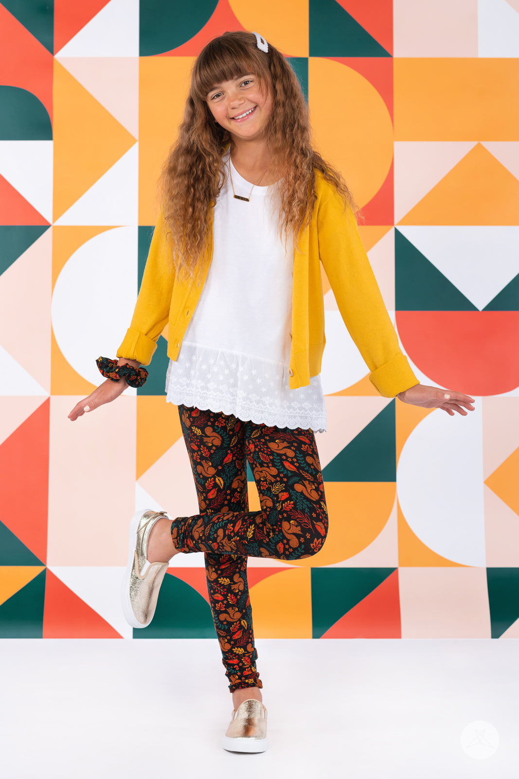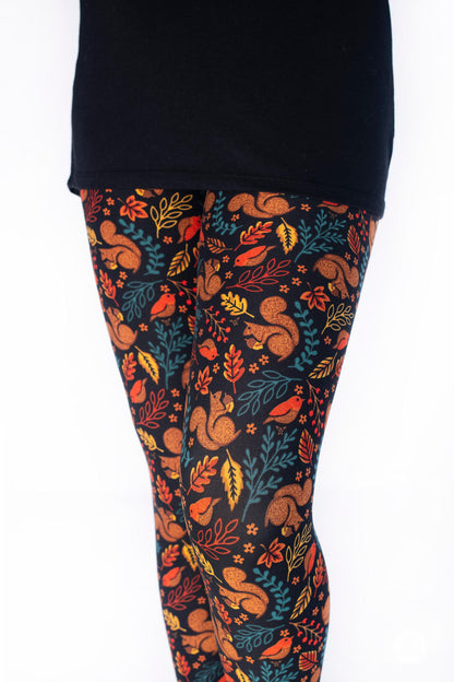 This print features fuzzy squirrels and chirping birds amongst fall foliage on a deep black background and is a perfect complement to your autumn wardrobe!