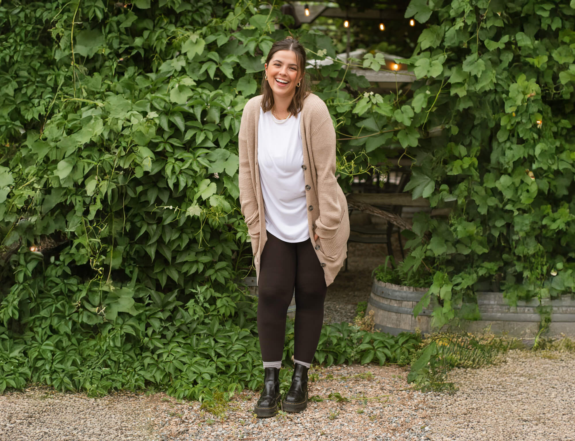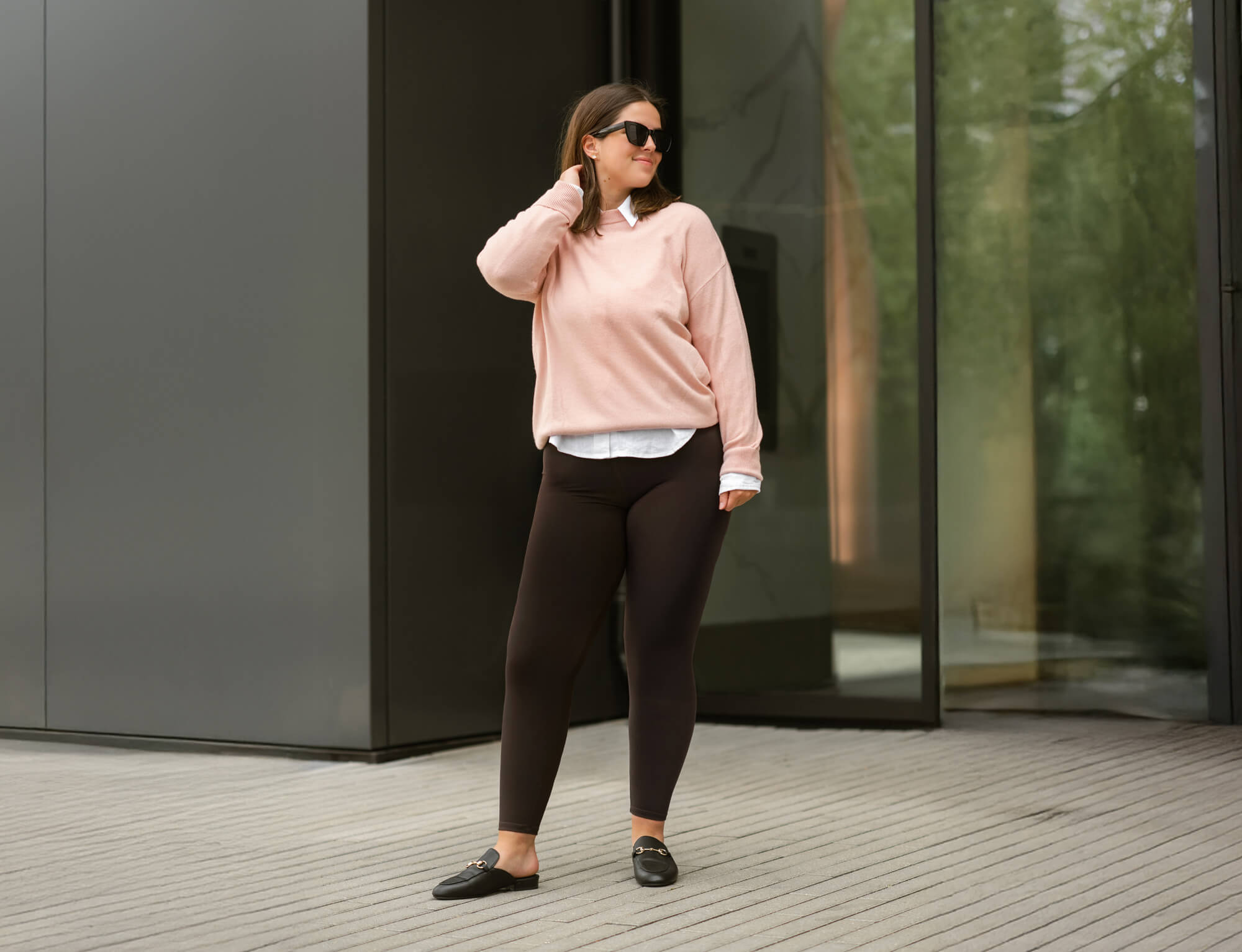 1. Soft Meets Sophisticated — Brown Leggings, Blush Layers, Effortless Style.