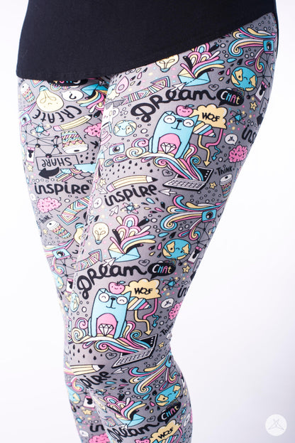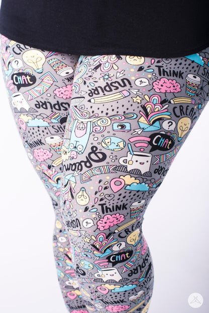 Fancy yourself the creative type? Look no further than Dreambook for your perfect pair of SweetLegs! Create, think, inspire, dream, and share with this fun print covered in all things imaginative featuring playful pops of pink, blue, yellow and white atop a cool grey background.