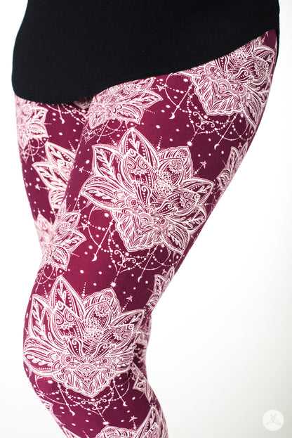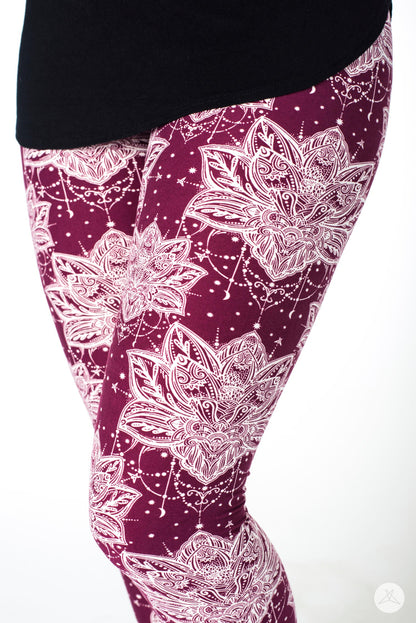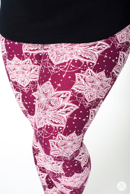 Hereafter features a serene white celestial-floral print atop a deep berry wine coloured background.